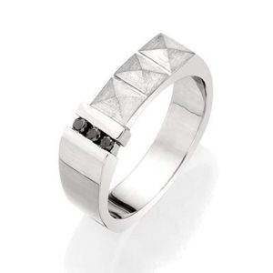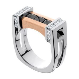 14kt white & rose gold gents ring with .85tw of princess cut white diamonds and 3.27tw of princess cut black diamonds