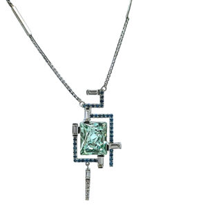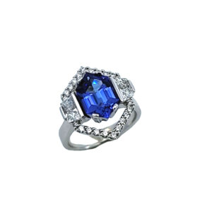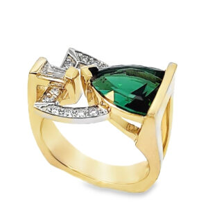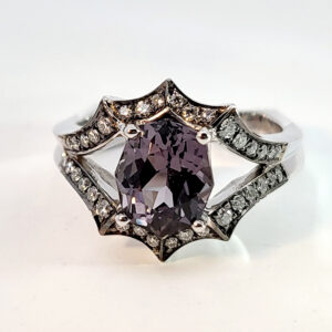 Radiant Cut Tourmaline Ring, 5.56cts in 14kt white & rose gold with .12cts of Diamonds and .60cts of Spinels.