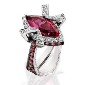 14kt white gold ring with a 5.86ct brilliant Tourmaline, 1.92tw of deep red garnets, and .62tw of diamonds