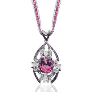 Brilliant Orchid Pink Tourmaline Oval 15.60cts Pendant with 1.50tw of white & purple diamonds in 14kt white gold.