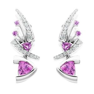 Pink Sapphire earrings 3.00cts with .42tw of round diamonds in 14kt white gold.