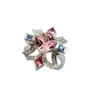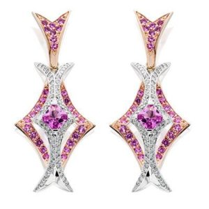 Radiant cut pink sapphire earrings with .80tw of round diamonds and 1.12tw of round pink sapphires. 14kt white & rose gold.