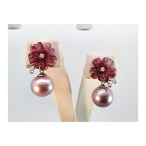 14kt white gold hand carved pink tourmaline floral earrings with lavender freshwater pearls and diamond accents