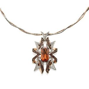 14kt white & rose gold necklace with a 8.02ct radiant cut Imperial Cognac Zircon. There are 1.65ct tw of white & cognac colored diamonds.